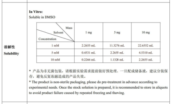 储存条件:Powder:2-8℃,2 years;Insolvent(母液):-20℃,6 months;-80℃,1 year