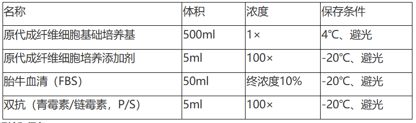 原代成纤维细胞培养体系是一个为体外生长的人、大鼠、小鼠、兔等哺乳动物的成纤维细胞设计的理想的完全培养基方案。本体系是一个基于碳酸氢盐的缓冲体系,可以在孵育的5%的CO2的气体环境下维持一个围绕pH7.2的酸碱缓冲体系。本体系是一个无菌的液体混合系统,其中包含必须和非必须氨基酸、维生素、激素、生长因子、微量元素和一些其他的有机和无机化合物以及胎牛血清(10%)。本培养体系是基于固定配方配制的液态培养体系,可以为体外培养的人、大鼠、小鼠、兔等哺乳动物的成纤维细胞提供一个确定适宜的平衡营养环境,并且可以选择性的促进成纤维细胞的扩增。