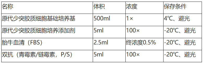 原代少突胶质细胞培养体系是一个为体外生长的人、大鼠、小鼠、兔等哺乳动物的少突胶质细胞设计的理想的完全培养基方案。本体系是一个基于碳酸氢盐的缓冲体系,可以在孵育的5%的CO2的气体环境下维持一个围绕pH7.2的酸碱缓冲体系。本体系是一个无菌的液体混合系统,其中包含必须和非必须氨基酸、维生素、激素、生长因子、微量元素和一些其他的有机和无机化合物以及一个低浓度的胎牛血清(0.5%)。本培养体系是基于固定配方配制的液态培养体系,可以为体外培养的人、大鼠、小鼠、兔等哺乳动物的少突胶质细胞提供一个确定适宜的平衡营养环境,并且可以选择性的促进少突胶质细胞的扩增。