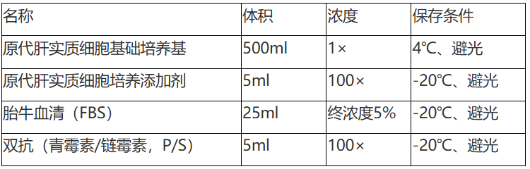 原代肝实质细胞培养体系是一个为体外生长的人、大鼠、小鼠、兔等哺乳动物的肝实质细胞设计的理想的完全培养基方案。本体系是一个基于碳酸氢盐的缓冲体系,可以在孵育的5%的CO2的气体环境下维持一个围绕pH7.2的酸碱缓冲体系。本体系是一个无菌的液体混合系统,其中包含必须和非必须氨基酸、维生素、激素、生长因子、微量元素和一些其他的有机和无机化合物以及一个低浓度的胎牛血清(5%)。本培养体系是基于固定配方配制的液态培养体系,可以为体外培养的人、大鼠、小鼠、兔等哺乳动物的肝实质细胞提供一个确定适宜的平衡营养环境,并且可以选择性的维持肝实质细胞的生存。