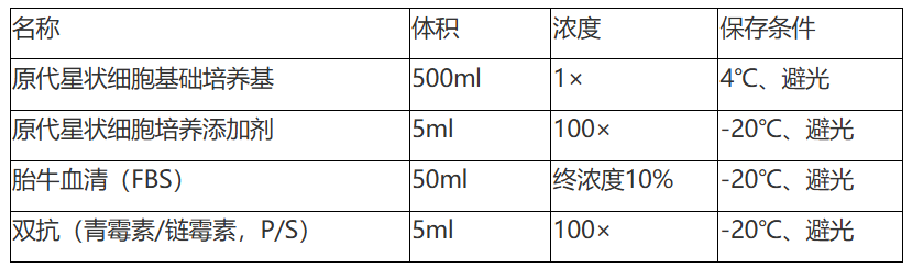 原代星状细胞培养体系是一个为体外生长的人、大鼠、小鼠、兔等哺乳动物的肝脏和胰脏等部位的星状细胞设计的理想的完全培养基方案。本体系是一个基于碳酸氢盐的缓冲体系,可以在孵育的5%的CO2的气体环境下维持一个围绕pH7.2的酸碱缓冲体系。本体系是一个无菌的液体混合系统,其中包含必须和非必须氨基酸、维生素、激素、生长因子、微量元素和一些其他的有机和无机化合物以及胎牛血清(10%)。本培养体系是基于固定配方配制的液态培养体系,可以为体外培养的人、大鼠、小鼠、兔等哺乳动物的星状细胞提供一个确定适宜的平衡营养环境,并且可以选使星状细胞能够尽量长时间保持静止状态。