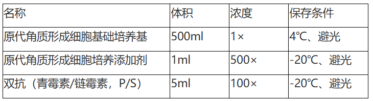 原代角质形成细胞培养体系是一个为体外生长的人、大鼠、小鼠、兔等哺乳动物的角质形成细胞、扁平上皮细胞和移行上皮细胞设计的理想的无血清完全培养基方案。本体系是一个基于碳酸氢盐的缓冲体系,可以在孵育的5%的CO2的气体环境下维持一个围绕pH7.2的酸碱缓冲体系。本体系是一个无菌的液体混合系统,其中包含必须和非必须氨基酸、维生素、激素、生长因子、微量元素和一些其他的有机和无机化合物。本培养体系是基于固定配方配制的液态培养体系,可以为体外培养的人、大鼠、小鼠、兔等哺乳动物的角质形成细胞、扁平上皮细胞和移行上皮细胞提供一个确定适宜的平衡营养环境,并且可以选择性的促进角质形成细胞、扁平上皮细胞和移行上皮细胞的增值。