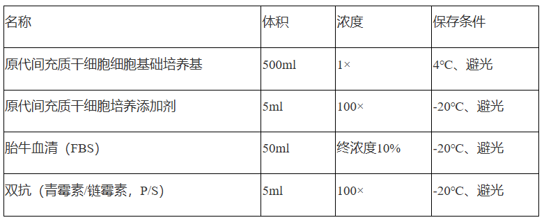 原代间充质干细胞培养体系是一个为体外生长的人、大鼠、小鼠、兔等哺乳动物的骨髓、脂肪、胎盘等部位间充质干细胞和牙髓干细胞、牙周膜干细胞设计的理想的完全培养基方案。本体系是一个基于碳酸氢盐的缓冲体系,可以在孵育的5%的CO2的气体环境下维持一个围绕pH7.2的酸碱缓冲体系。本体系是一个无菌的液体混合系统,其中包含必须和非必须氨基酸、维生素、激素、生长因子、微量元素和一些其他的有机和无机化合物以及胎牛血清(10%)。本培养体系是基于固定配方配制的液态培养体系,可以为体外培养的人、大鼠、小鼠、兔等哺乳动物的骨髓、脂肪、胎盘等部位间充质干细胞和牙髓干细胞、牙周膜干细胞提供一个确定适宜的平衡营养环境,并且可以选择性的促进骨髓、脂肪、胎盘等部位间充质干细胞和牙髓干细胞、牙周膜干细胞的扩增。