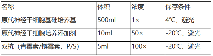 原代神经干细胞培养体系是一个为体外生长的人、大鼠、小鼠、兔等哺乳动物的神经干细胞设计的理想的无血清完全培养基方案。本体系是一个基于碳酸氢盐的缓冲体系,可以在孵育的5%的CO2的气体环境下维持一个围绕pH7.2的酸碱缓冲体系。本体系是一个无菌的液体混合系统,其中包含必须和非必须氨基酸、维生素、激素、微量元素、B27等生长因子和一些其他的有机和无机化合物。本培养体系是基于固定配方配制的液态培养体系,可以为体外培养的人、大鼠、小鼠、兔等哺乳动物的神经干细胞提供一个确定适宜的平衡营养环境,并且可以选择性的促进神经球结构的形成,同时促进神经干细胞的增殖。