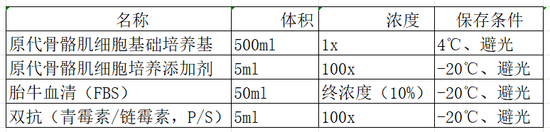 原代骨骼肌细胞培养体系是一个为体外生长的人、大鼠、小鼠、兔等哺乳动物的骨骼肌细胞设计的理想的完全培养基方案。本体系是一个基于碳酸氢盐的缓冲体系,可以在孵育的5%的CO2的气体环境下维持一个围绕pH7.2的酸碱缓冲体系。本体系是一个无菌的液体混合系统,其中包含必须和非必须氨基酸、维生素、激素、生长因子、微量元素和一些其他的有机和无机化合物以及胎牛血清(10%)。本培养体系是基于固定配方配制的液态培养体系,可以为体外培养的人、大鼠、小鼠、兔等哺乳动物的骨骼肌细胞提供一个确定适宜的平衡营养环境,并且可以选择性的促进骨骼肌细胞的扩增。