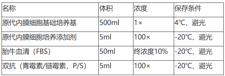 原代内膜细胞培养体系是一个为体外生长的人、大鼠、小鼠、兔等哺乳动物器官中的内膜细胞设计的理想的完全培养基方案。本体系是一个基于碳酸氢盐的缓冲体系,可以在孵育的5%的CO2的气体环境下维持一个围绕pH7.2的酸碱缓冲体系。本体系是一个无菌的液体混合系统,其中包含必须和非必须氨基酸、维生素、激素、生长因子、微量元素和一些其他的有机和无机化合物以及胎牛血清(10%)。本培养体系是基于固定配方配制的液态培养体系,可以为体外培养的人、大鼠、小鼠、兔等哺乳动物器官中的内膜细胞提供一个确定适宜的平衡营养环境,并且可以选择性的促进内膜细胞的扩增。
